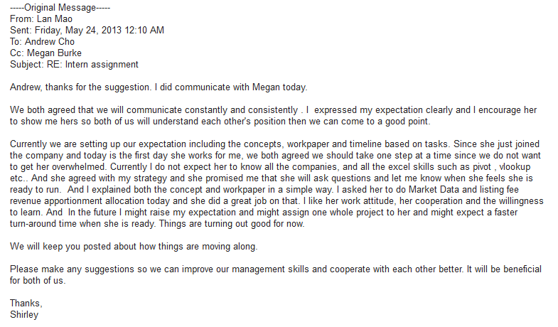 "Megan's best quality is that she is always willing to help out when she is needed most.The word "NO" is non existant in her vocabulary and that is why she excels at work. Her positive attitude and her ability to take life by the horns will always serve her right. I stay corrected when I say that she will always and forever more be an examplar employee wherever she goes. You will be missed here at the New York Stock Exchange Megan Burke."