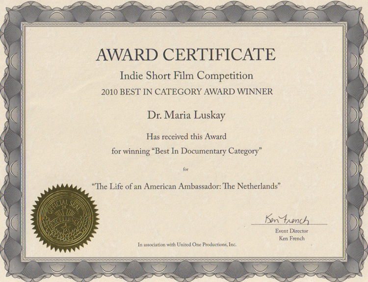 - 2010 Indie Short Film Competition Award for ‘Documentary’ category, The Life of an American Ambassador, 2009, Producer