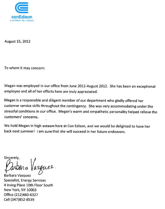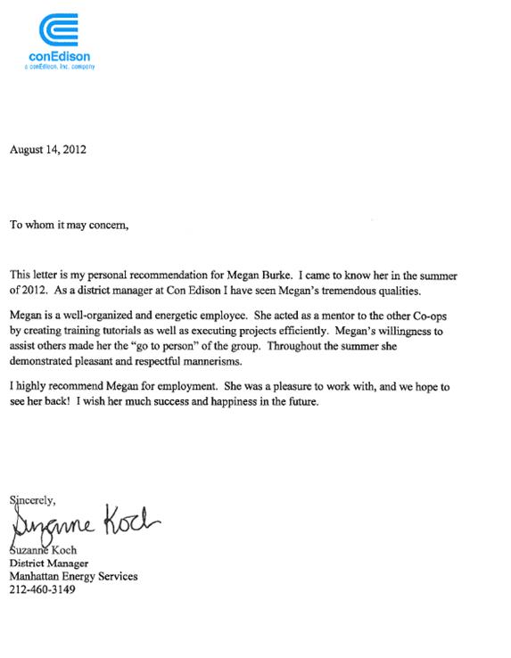 "I have worked with Megan at Con Edison for the entire summer. Three words to describe her are: hard working, organized, and resourceful. Megan was a pleasure to work with and I would recommend her for any future position she applied for. She is a team player, and I hope to work with Megan again next summer!"