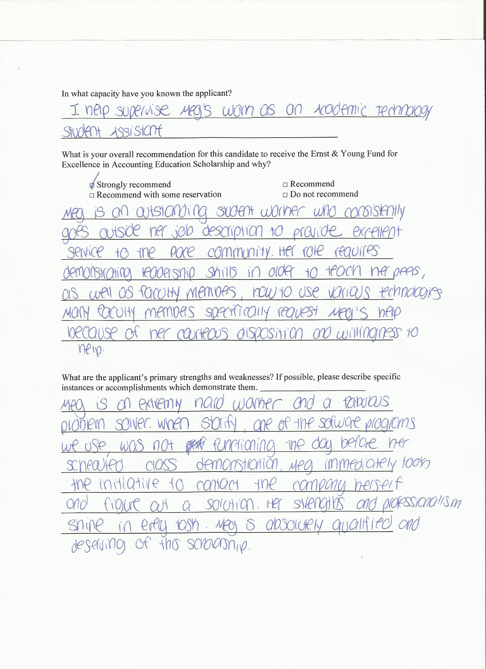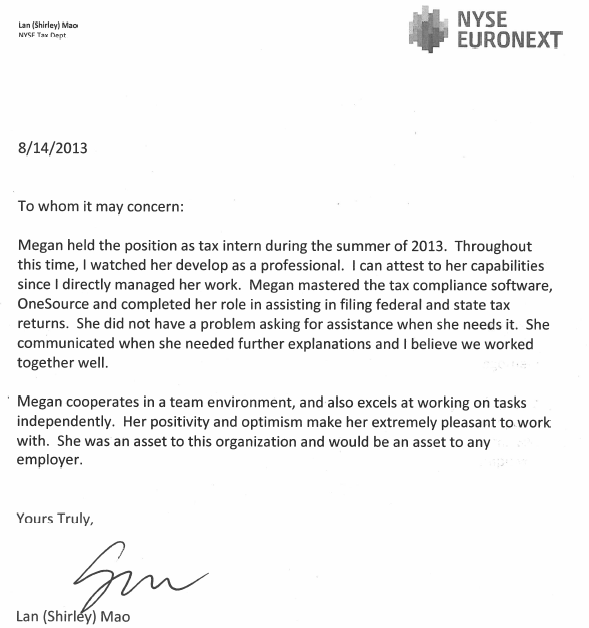 “I had the pleasure to work with Megan during her internship at the New York Stock Exchange. In observing her work I noticed her progress among the others interns and how quickly she was able to adapt through challenging assignments.