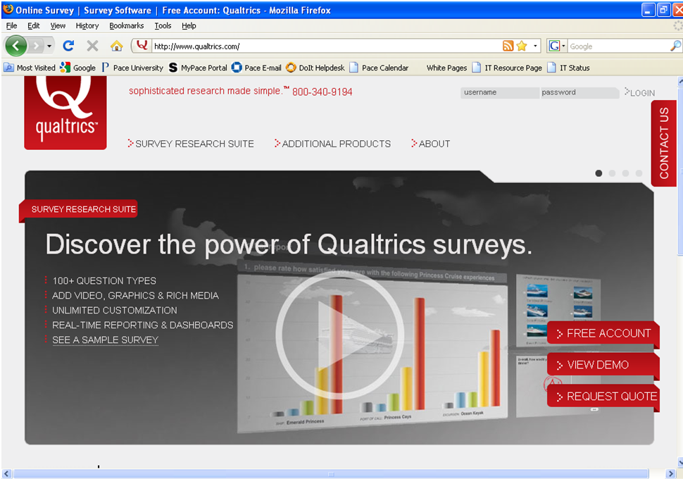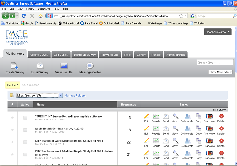 My current position involves creating surveys used for assessment at the College of Health Professions, one of the colleges at Pace University. I often use Qualtrics to create, manage and generate reports for the surveys I conduct. Qualtrics is an online survey software, used by some universities to conduct research, mostly through conducting surveys. Most of the assessments I manage are academic, but a small percentage are administrative assessments designed for internal measures. Over the course of a calendar year, I manage approximately 200 surveys. The design of the questions, as well as the design of the survey itself has much to do with how it's received and the overall response rate. I also handle analyzing the data and preparing presentations, so the process improvements may come of the feedback I have received. Below are two screenshots, showing what Qualtrics online software looks like. It's user friendly and staff, faculty and students at Pace may use Quatrics free of charge. Click on the Qualtrics logo below to visit the site.